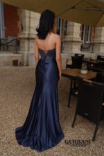 The structured, strapless corset bodice is covered in detailed crystal beadwork that sparkles beautifully with every move. The sleek boning shapes the torso and gives it a statuesque shape while also supporting it. The gown flows from the waist into a shiny satin skirt. The subtle ruching on the skirt makes curves stand out and adds depth to the design. A daring thigh-high slit not only makes the legs look longer, but it also adds graceful movement and a touch of modern style.