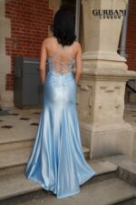 The bodice of the dress is stunning, with detailed sequin embroidery over sheer illusion mesh. This creates a bold but elegant corset shape that hugs the waist and looks very sexy. The sweetheart neckline, which is held up by thin straps, makes the décolletage look beautiful without any effort. The smooth satin skirt flows from the cinched waist and hugs the hips before flaring out into a soft train. It also has a daring thigh-high slit that adds just the right amount of drama.