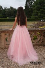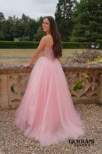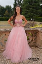 The gown features layers of soft pink tulle, complemented by a structured corset bodice adorned with shimmering sequins and delicate beadwork. A sweetheart neckline frames the shoulders and collarbone with elegance, while the sheer boned corset adds both structure and a subtle touch of allure.